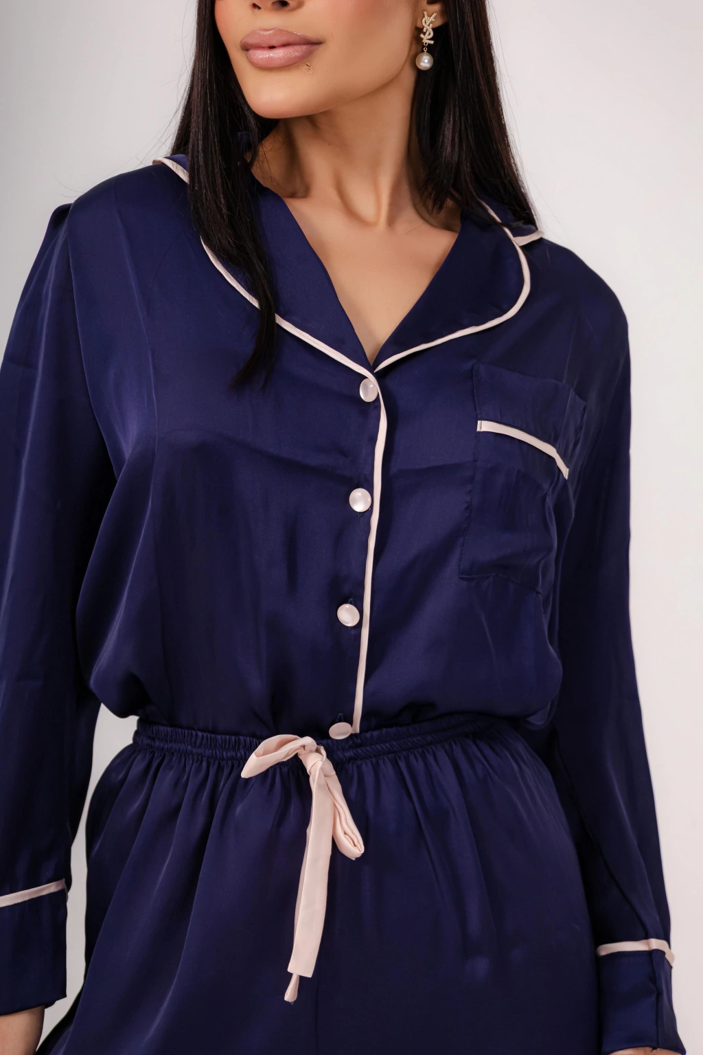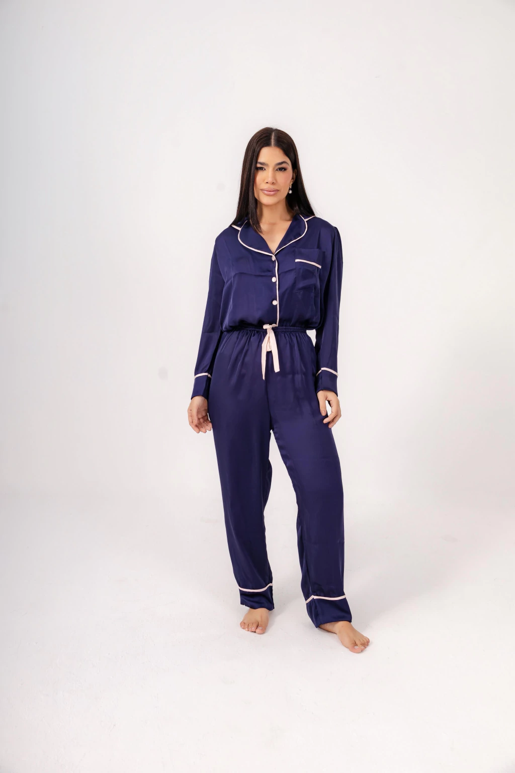 Conforto com presença. Em satin azul-marinho, o Lara combina toque suave, caimento impecável e a elegância clássica do estilo americano.
